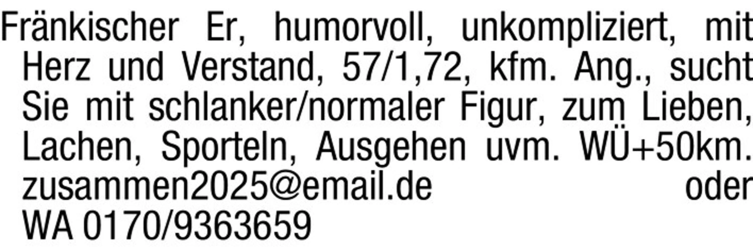 Frnkischer Er, humorvoll, unkompliziert, mit Herz und Verstand, 57/1,72, kfm. Ang., sucht Sie mit schlanker/normaler Figur, zum Lieben, Lachen, Sporteln, Ausgehen uvm.