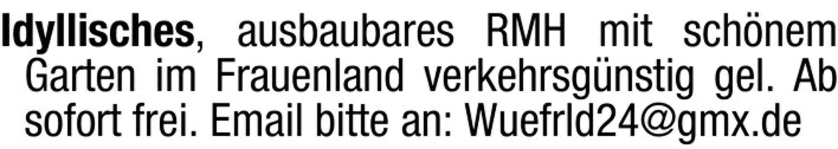 Idyllisches, ausbaubares RMH mit schnem Garten im Frauenland verkehrsgünstig gelegen. Ab sofort frei. Email bitte an: Wuefrld24@gmx.de