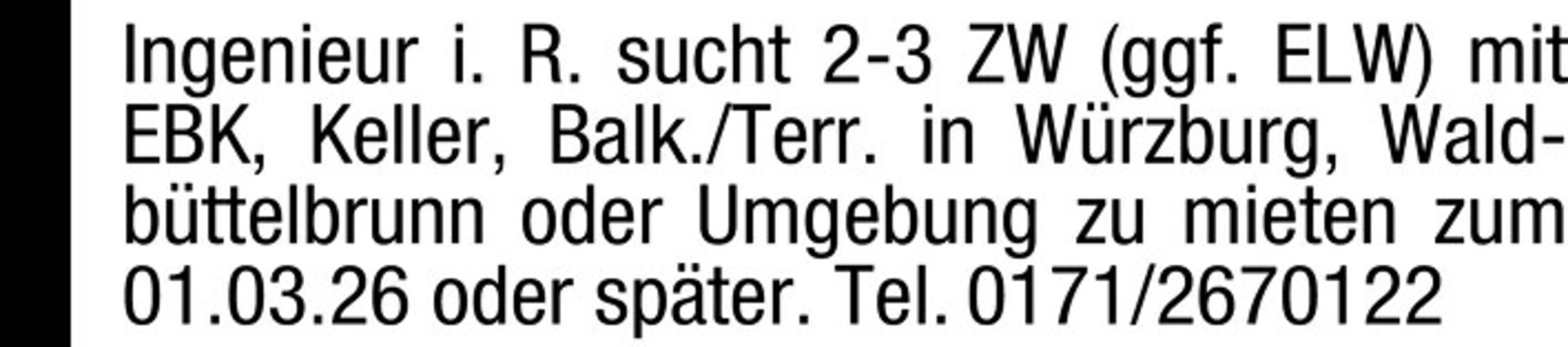text Ingenieur i. R. sucht 2-3 ZW (ggf. ELW) mit EBK, Keller, Balk./Terr. in Wrzburg, Waldbttelbrunn oder Umgebung zu mieten zum 01.03.26 oder spter. Tel. 0171/2670122