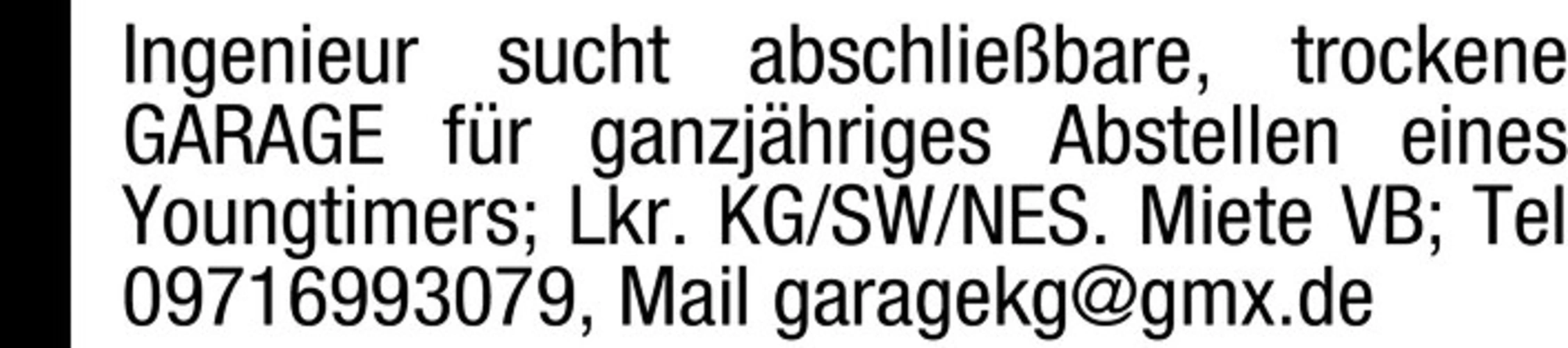 Ingenieur sucht abschliebare, trockene GARAGE fr ganzjhriges Abstellen eines Youngtimers; Lkr. KG/SW/NES. Miete VB; Tel 09716993079, Mail garagekg@gmx.de