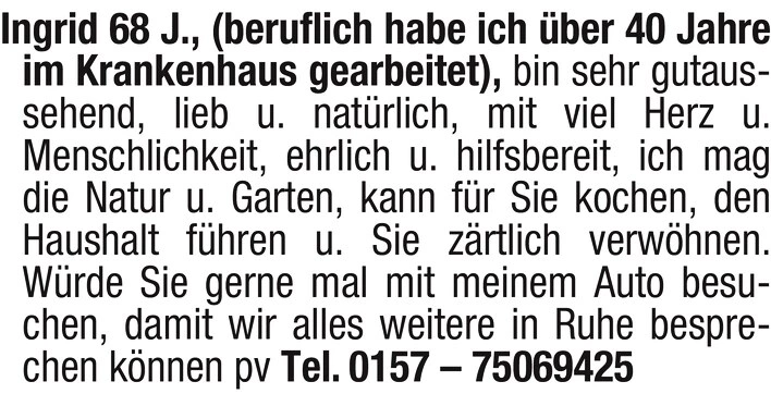 Ingrid, 68, sucht verständnisvolle Beziehung