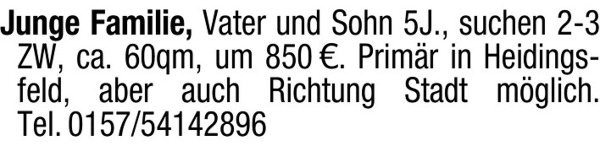 Junge Familie, Vater und Sohn 5J., suchen 2-3 ZW, ca. 60qm, um 850. Primr in Heidingsfeld, aber auch Richtung Stadt möglich. Tel. 0157/54142896