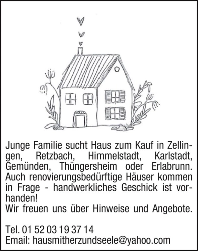 Junge Familie sucht Haus zum Kauf in Zellingen, Retzbach, Himmelstadt, Karlstadt, Gemünden, Thüngersheim oder Erlabrunn. Auch renovierungsbedürftige Häuser kommen in Frage - handwerkliches Geschick ist vorhanden!
