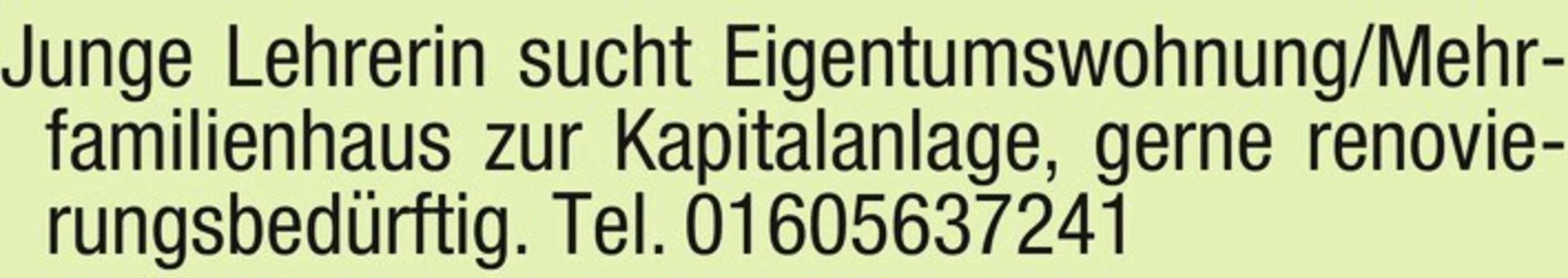 Junge Lehrerin sucht Eigentumswohnung/Mehrfamilienhaus zur Kapitalanlage, gerne renovierungsbedrftig. Tel. 01605637241