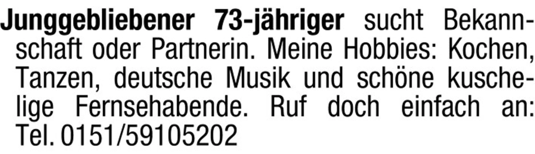 Junggebliebener 73-jähriger sucht Bekannschaft oder Partnerin