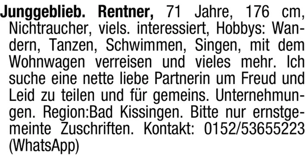 Junggeblieb. Rentner, 71 Jahre, 176 cm, Nichtraucher, viels. interessiert, Hobbys: Wandern, Tanzen, Schwimmen, Singen, mit dem Wohnwagen verreisen und vieles mehr. Ich suche eine nette liebe Partnerin um Freud und Leid zu teilen und fr gemeins. Unternehmungen. Region:Bad Kissingen. Bitte nur ernstgemeinte Zuschriften. Kontakt: 0152/53655223 (WhatsApp)