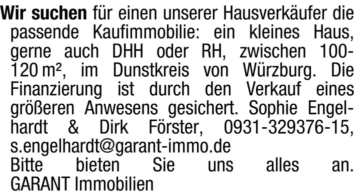 Wir suchen für einen unserer Hausverkäufer die passende Kaufimmobilie: ein kleines Haus, gerne auch DHH oder RH, zwischen 100-120 m², im Dunstkreis von Würzburg. Die Finanzierung ist durch den Verkauf eines größeren Anwesens gesichert. Sophie Engelhardt & Dirk Förster, 0931-329376-15, s.engelhardt@garant-immo.de Bitte bieten Sie uns alles an.
