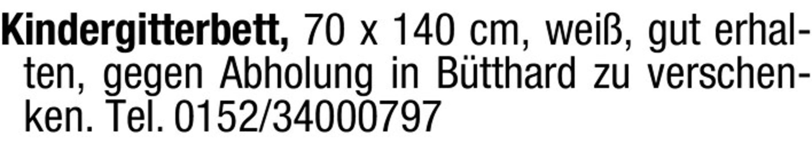 Kindergitterbett, 70 x 140 cm, wei, gut erhalten, gegen Abholung in Btthard zu verschenken. Tel. 0152/34000797