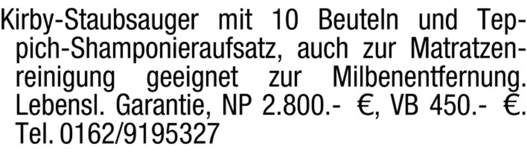 Kirby-Staubsauger mit 10 Beuteln und Teppich-Shamponieraufsatz, auch zur Matratzenreinigung geeignet zur Milbenentfernung. Lebensl. Garantie, NP 2.800.- , VB 450.- . Tel. 0162/9195327