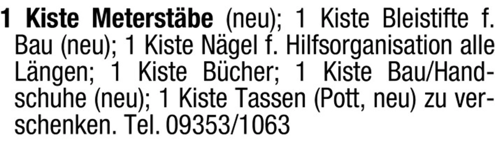 1 Kiste Meterstbe (neu); 1 Kiste Bleistifte f. Bau (neu); 1 Kiste Ngel f. Hilfsorganisation alle Lngen; 1 Kiste Bcher; 1 Kiste Bau/Handschuhe (neu); 1 Kiste Tassen (Pott, neu) zu verschenken. Tel. 09353/1063