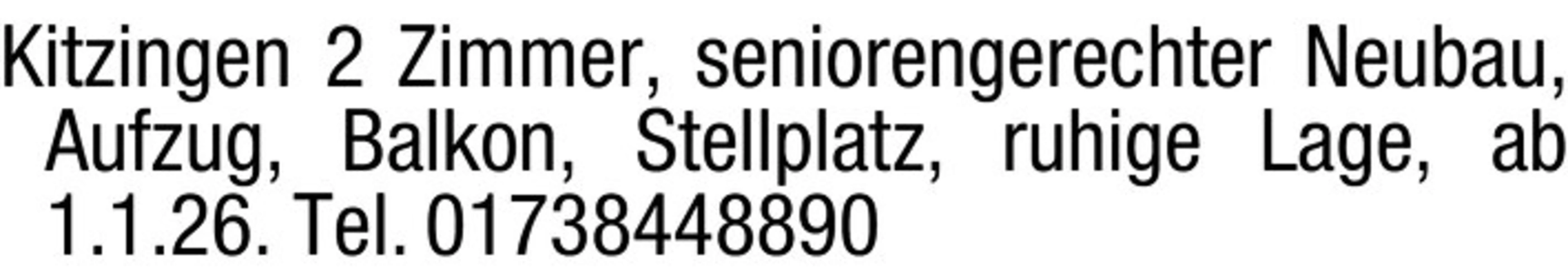 • Kitzingen 2 Zimmer, seniorengerechter Neubau, Aufzug, Balkon, Stellplatz, ruhige Lage, ab 1.1.26. Tel. 01738448890