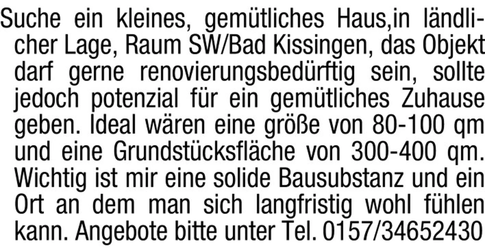 Suche ein kleines, gemtliches Haus,in lndlicher Lage, Raum SW/Bad Kissingen, das objekt darf gerne renovierungsbedrftig sein, sollte jedoch potenzial fr ein gemtliches Zuhause geben. Ideal wren eine gre von 80-100 qm und eine Grundstcksflche von 300-400 qm. Wichtig ist mir eine solide Bausubstanz und ein Ort an dem man sich langfristig wohl fhlen kann. Angebote bitte unter Tel. 0157/34652430