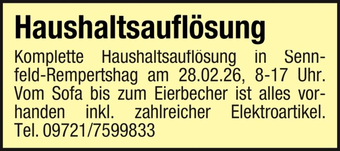 Haushaltsauflsung Komplette Haushaltsauflsung in Sennfeld-Rempertshag am 28.02.26, 8-17 Uhr. Vom Sofa bis zum Eierbecher ist alles vorhanden inkl. zahlreicher Elektroartikel. Tel. 09721/7599833