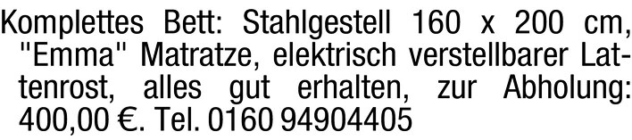 Komplettes Bett: Stahlgestell 160 x 200 cm, "Emma" Matratze, elektrisch verstellbarer Lattenrost, alles gut erhalten, zur Abholung: 400,00