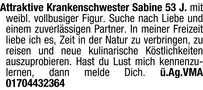 Attraktive Krankenschwester Sabine 53 J. mit weibl. vollbusiger Figur. Suche nach Liebe und einem zuverlässigen Partner. In meiner Freizeit liebe ich es, Zeit in der Natur zu verbringen, zu reisen und neue kulinarische Köstlichkeiten auszuprobieren. Hast du Lust mich kennenzulernen, dann melde Dich.