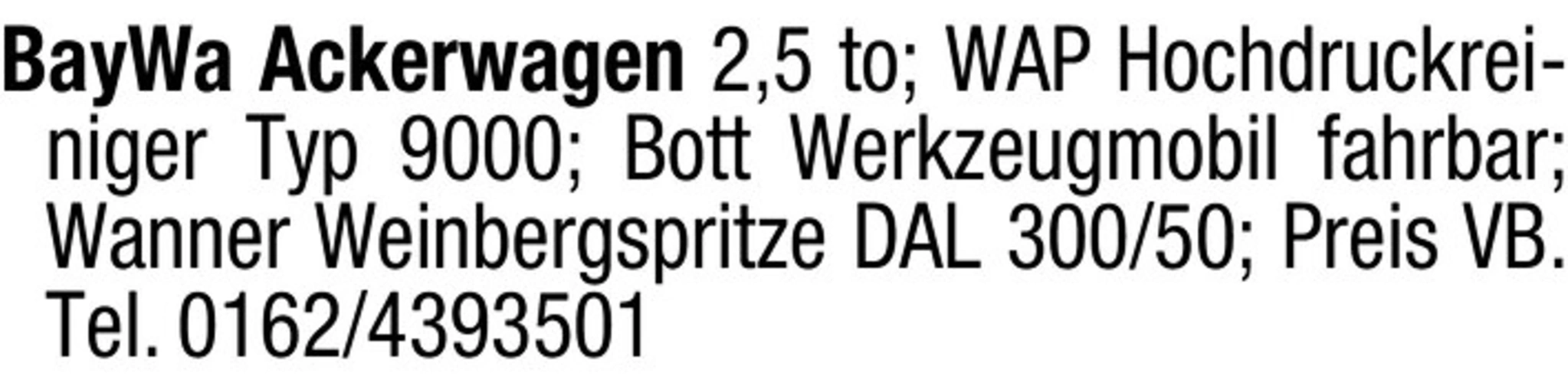 BayWa Ackerwagen 2,5 to; WAP Hochdruckreiniger Typ 9000; Bott Werkzeugmobil fahrbar; Wanner Weinbergspritze DAL 300/50; Preis VB. Tel. 0162/4393501