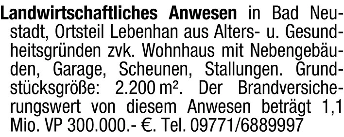 Landwirtschaftliches Anwesen in Bad Neustadt, Ortsteil Lebenhan aus Alters- und Gesundheitsgründen zu verkaufen.