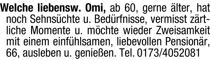 Welche liebensw. Omi, ab 60, gerne älter, hat noch Sehnsüchte u. Bedürfnisse, vermisst zärtliche Momente u. möchte wieder Zweisamkeit mit einem einfühlsamen, liebevollen Pensionär, 66, ausleben u. genießen.