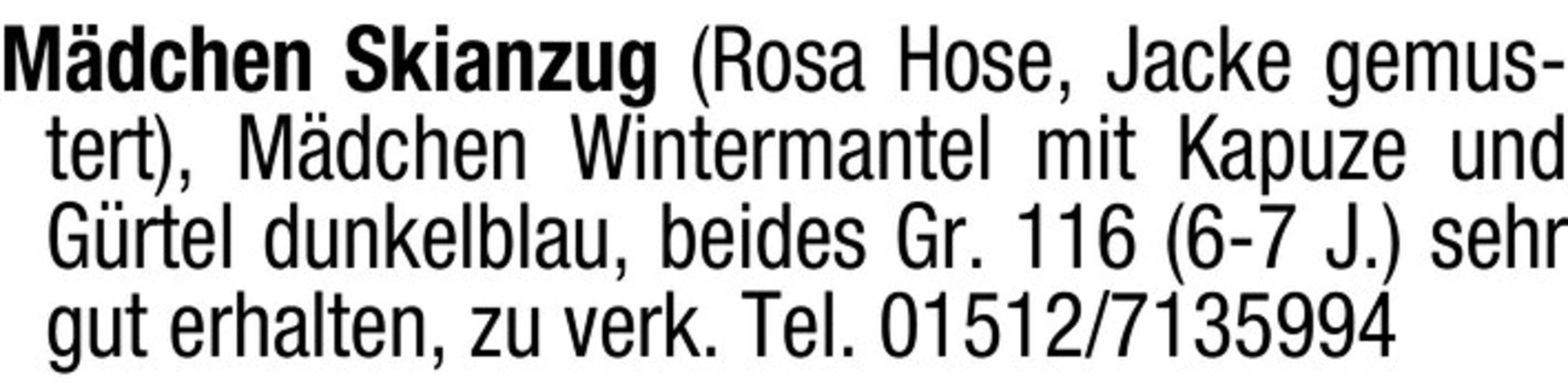 markdown Mdchen Skianzug (Rosa Hose, Jacke gemustert), Mdchen Wintermantel mit Kapuze und Grtel dunkelblau, beides Gr. 116 (6-7 J.) sehr gut erhalten, zu verk. Tel. 01512/7135994