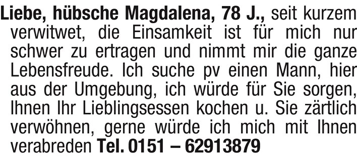 Liebe, hübsche Magdalena, 78 J., seit kurzem verwitwet, die Einsamkeit ist für mich nur schwer zu ertragen und nimmt mir die ganze Lebensfreude. Ich suche privat einen Mann, hier aus der Umgebung, ich würde für Sie sorgen, Ihnen Ihr Lieblingsessen kochen u. Sie zärtlich verwöhnen, gerne würde ich mich mit Ihnen verabreden