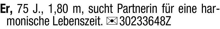 Er, 75 J., 1,80 m, sucht Partnerin für eine harmonische Lebenszeit.