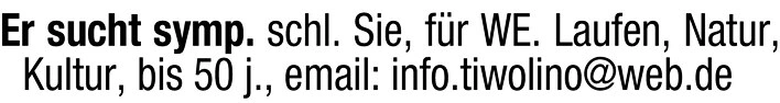 Er sucht symp. schl. Sie, fr WE. Laufen, Natur, Kultur, bis 50 j., email: info.tiwolino@web.de
