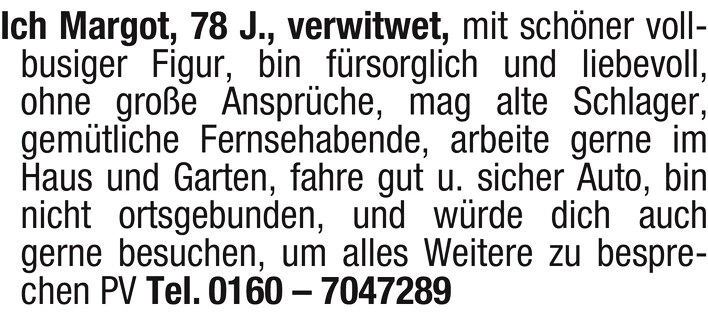 Ich Margot, 78 J., verwitwet, mit schner vollbusiger Figur, bin frsorglich und liebevoll, ohne groe Ansprche, mag alte Schlager, gemtliche Fernsehabende, arbeite gerne im Haus und Garten, fahre gut u. sicher Auto, bin nicht ortsgebunden, und wrde dich auch gerne besuchen, um alles Weitere zu besprechen PV Tel. 0160 - 7047289