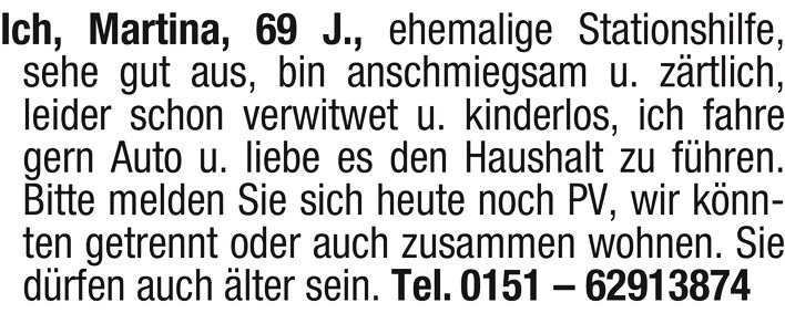 Ich, Martina, 69 J., ehemalige Stationshilfe, sehe gut aus, bin anschmiegsam u. zrtlich, leider schon verwitwet u. kinderlos, ich fahre gern Auto u. liebe es den Haushalt zu fhren. Bitte melden Sie sich heute noch PV, wir knnten getrennt oder auch zusammen wohnen. Sie drfen auch lter sein. Tel. 0151 - 62913874