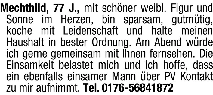 Mechthild, 77 J., mit schner weibl. Figur und Sonne im Herzen, bin sparsam, gutmtig, koche mit Leidenschaft und halte meinen Haushalt in bester Ordnung. Am Abend wrde ich gerne gemeinsam mit Ihnen fernsehen. Die Einsamkeit belastet mich und ich hoffe, dass ein ebenfalls einsamer Mann ber PV Kontakt zu mir aufnimmt.