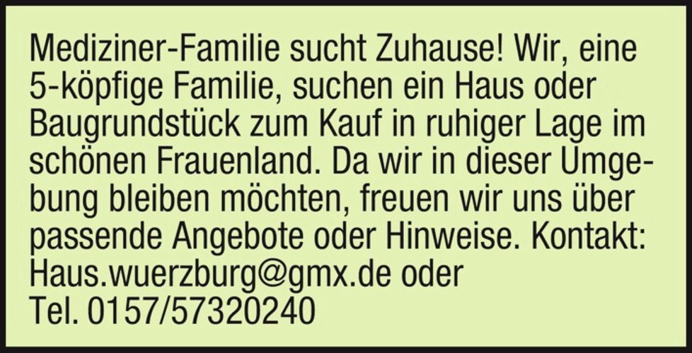 Wir, eine 5-köpfige Familie, suchen ein Haus oder Baugrundstück zum Kauf in ruhiger Lage im schönen Frauenland. Da wir in dieser Umgebung bleiben möchten, freuen wir uns über passende Angebote oder Hinweise.