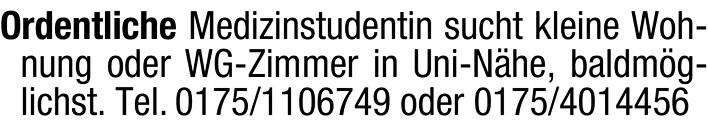 Ordentliche Medizinstudentin sucht kleine Wohnung oder WG-Zimmer in Uni-Nhe, baldmglichst. Tel. 0175/1106749 oder 0175/4014456