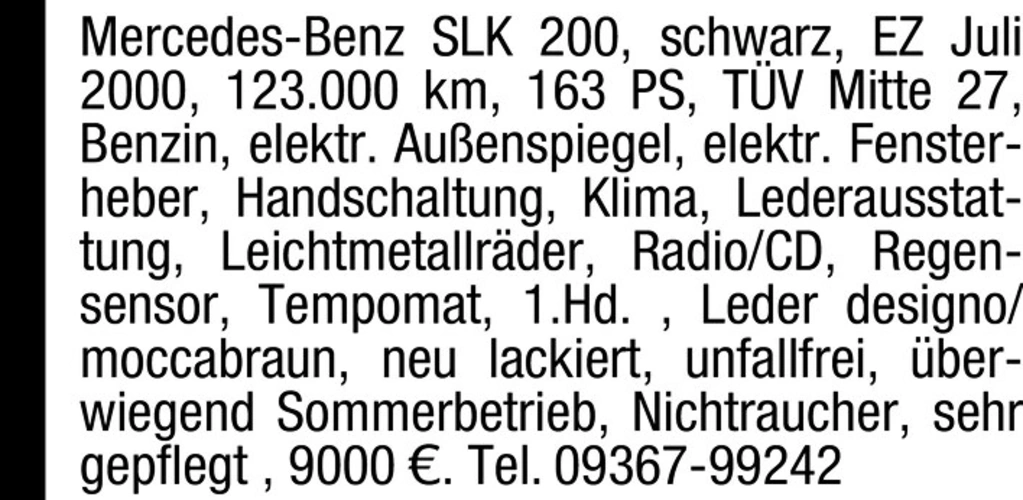 Mercedes-Benz SLK 200, schwarz, EZ Juli 2000, 123.000 km, 163 PS, TV Mitte 27, Benzin, elektr. Auenspiegel, elektr. Fensterheber, Handschaltung, Klima, Lederausstattung, Leichtmetallrder, Radio/CD, Regensensor, Tempomat, 1.Hd. , Leder designo/ moccabraun, neu lackiert, unfallfrei, berwiegend Sommerbetrieb, Nichtraucher, sehr gepflegt , 9000 . Tel: 09367-99242