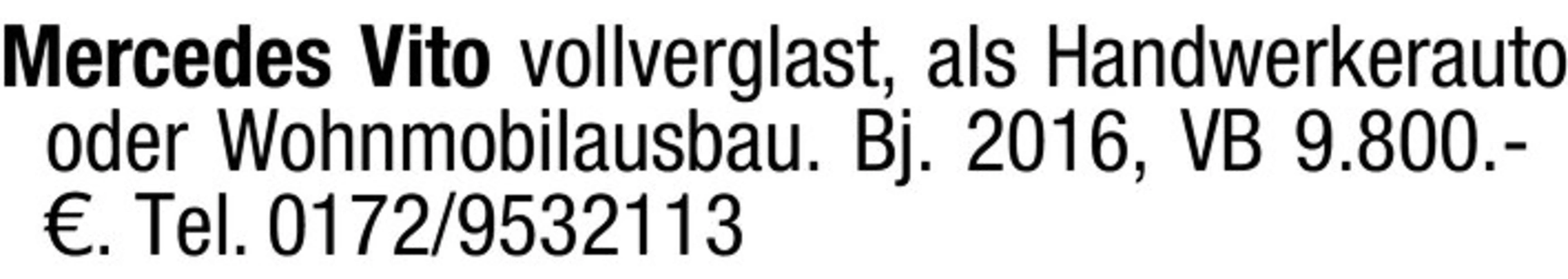text Mercedes Vito vollverglast, als Handwerkerauto oder Wohnmobilausbau. Bj. 2016, VB 9.800.- . Tel. 0172/9532113