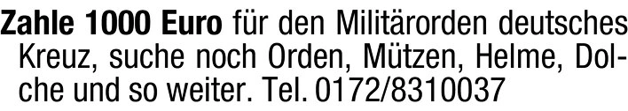 Zahle 1000 Euro für den Militärorden deutsches Kreuz, suche noch Orden, Mützen, Helme, Dolche und so weiter.