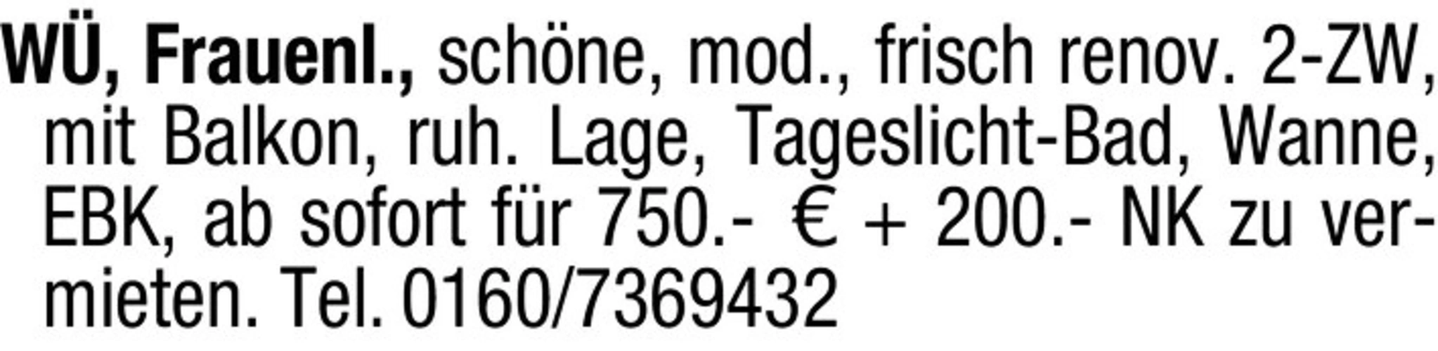 W, Frauenl., schne, mod., frisch renov. 2-ZW, mit Balkon, ruh. Lage, Tageslicht-Bad, Wanne, EBK, ab sofort fr 750.- 200.- NK zu vermieten. Tel. 0160/7369432