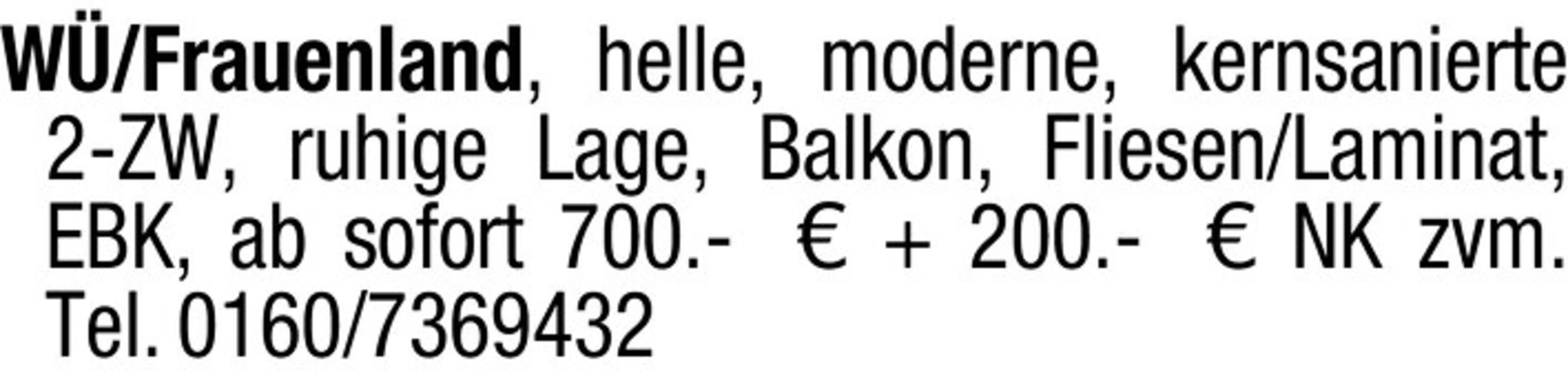 W/Frauenland, helle, moderne, kernsanierte 2-ZW, ruhige Lage, Balkon, Fliesen/Laminat, EBK, ab sofort 700.- 200.- NK zvm. Tel. 0160/7369432