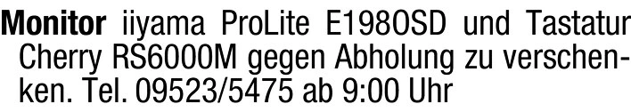 Monitor iiyama ProLite E198OSD und Tastatur Cherry RS6000M gegen Abholung zu verschenken. Tel. 09523/5475 ab 9:00 Uhr