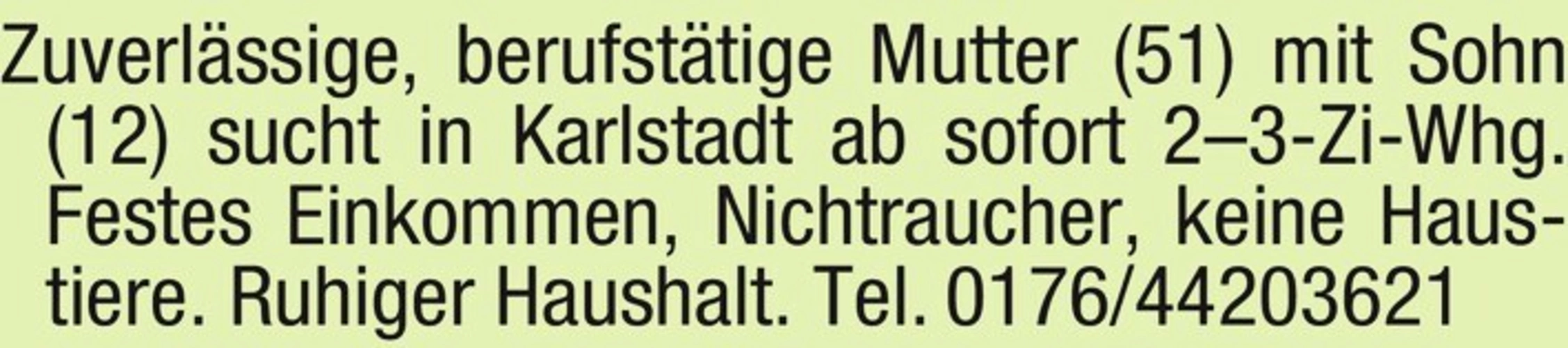 Zuverlässige, berufstätige Mutter (51) mit Sohn (12) sucht in Karlstadt ab sofort 2-3-Zi-Whg.