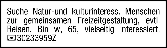 Suche Natur- und kulturinteress. Menschen zur gemeinsamen Freizeitgestaltung, evtl. Reisen. Bin w, 65, vielseitig interessiert.