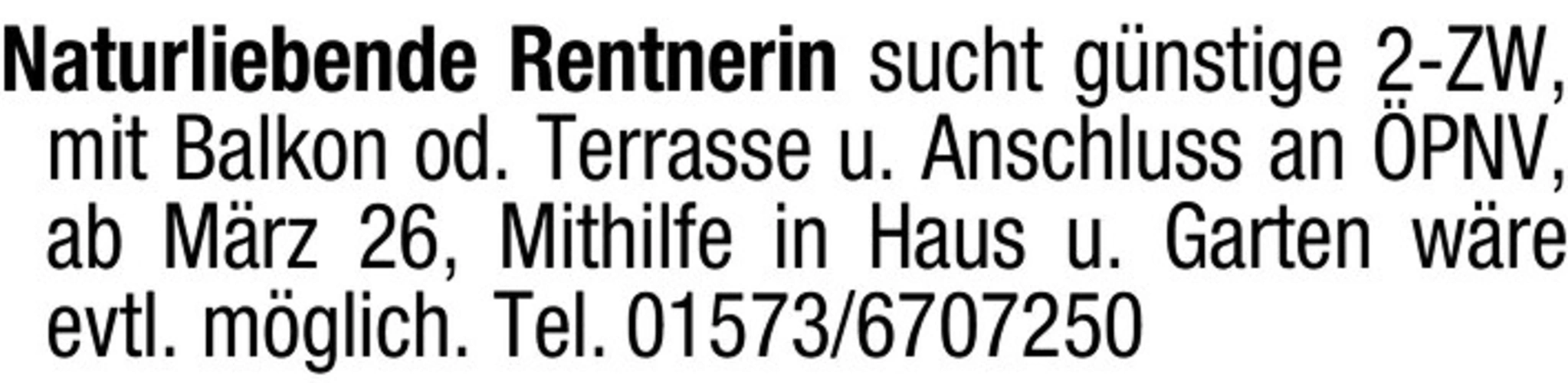 Naturliebende Rentnerin sucht gnstige 2-ZW, mit Balkon od. Terrasse u. Anschluss an PNV, ab Mrz 26, Mithilfe in Haus u. Garten wre evtl. mglich. Tel. 01573/6707250