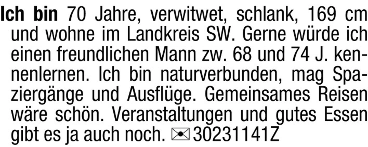 Gerne würde ich einen freundlichen Mann zwischen 68 und 74 Jahren kennenlernen.