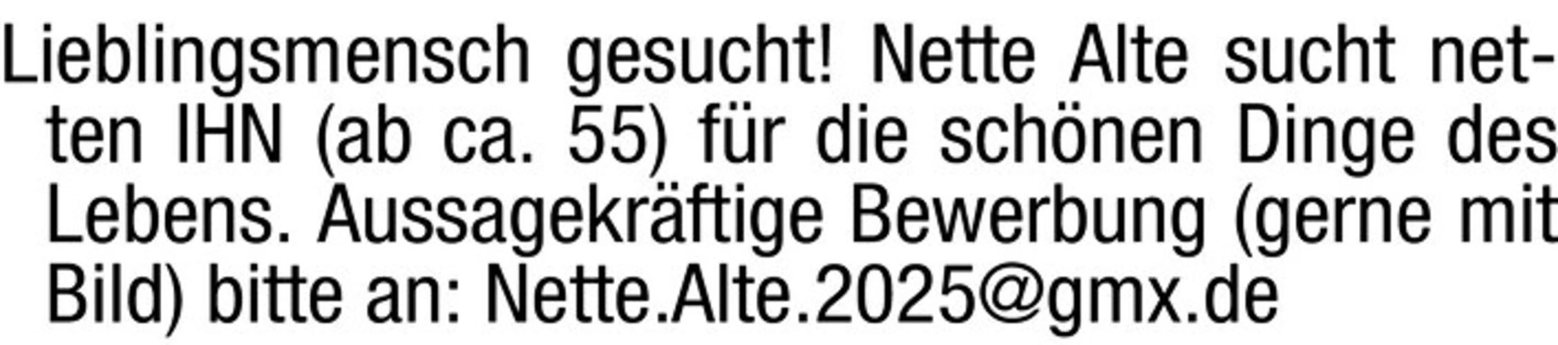 Aussagekräftige Bewerbung (gerne mit Bild) bitte an: Nette.Alte.2025@gmx.de