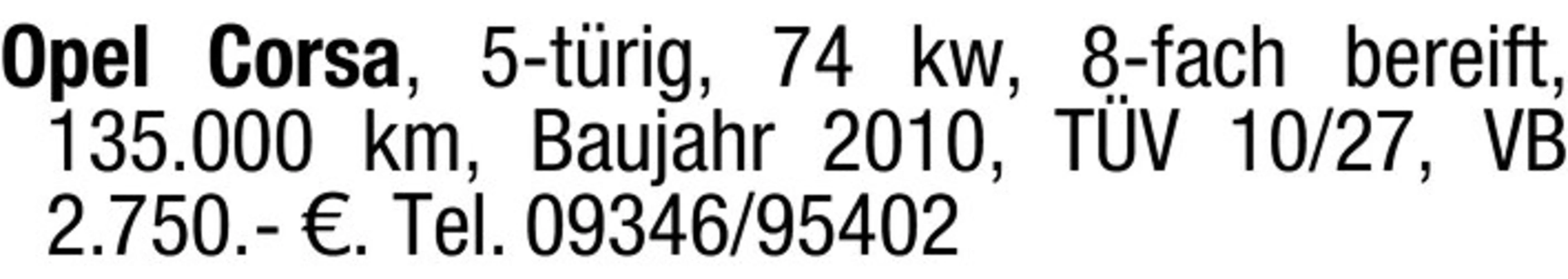 Opel Corsa, 5-trig, 74 kw, 8-fach bereift, 135.000 km, Baujahr 2010, TV 10/27, VB 2.750.- . Tel. 09346/95402