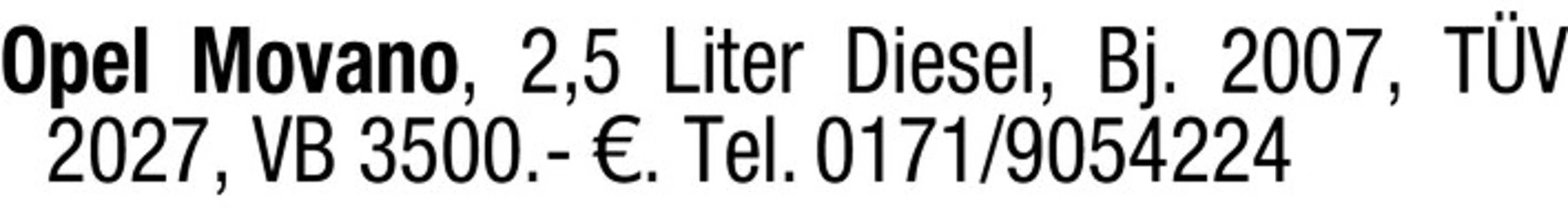 Opel Movano, 2,5 Liter Diesel, Bj. 2007, TV 2027, VB 3500.- . Tel. 0171/9054224