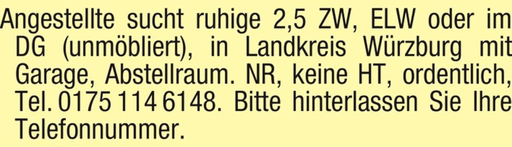 Angestellte sucht ruhige 2,5 ZW, ELW oder im DG (unmöbliert), in Landkreis Würzburg mit Garage, Abstellraum. NR, keine HT, ordentlich, Tel. 0175 114 6148. Bitte hinterlassen Sie Ihre Telefonnummer.