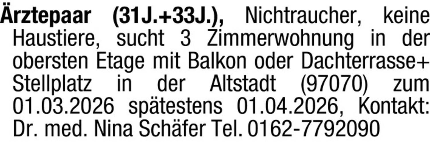 rztepaar (31J. 33J.), Nichtraucher, keine Haustiere, sucht 3 Zimmerwohnung in der obersten Etage mit Balkon oder Dachterrasse Stellplatz in der Altstadt (97070) zum 01.03.2026 sptestens 01.04.2026, Kontakt: Dr. med. Nina Schfer Tel. 0162-7792090