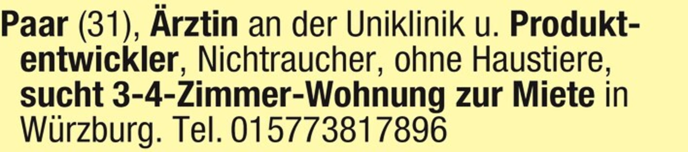 Paar (31), rztin an der Uniklinik u. Produktentwickler, Nichtraucher, ohne Haustiere, sucht 3-4-Zimmer-Wohnung zur Miete in Würzburg.