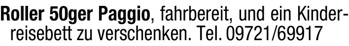 Roller 50er Paggio, fahrbereit, und ein Kinderreisebett zu verschenken.