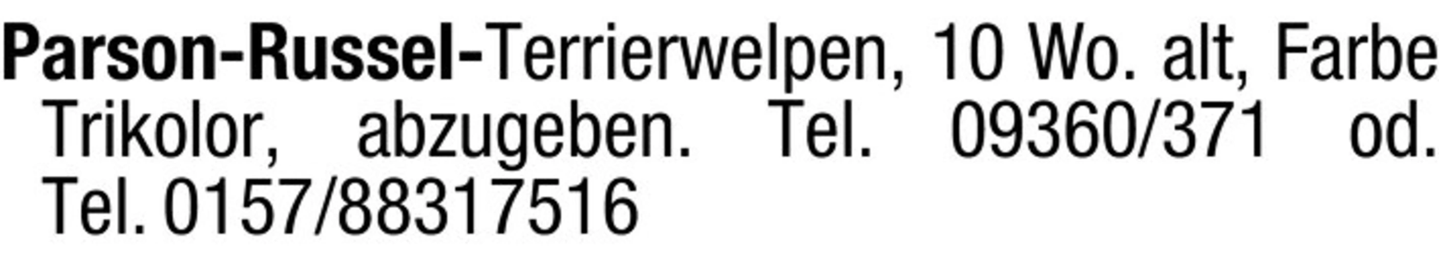 Parson-Russel-Terrierwelpen, 10 Wo. alt, Farbe Trikolor, abzugeben. Tel. 09360/371 od. Tel. 0157/88317516