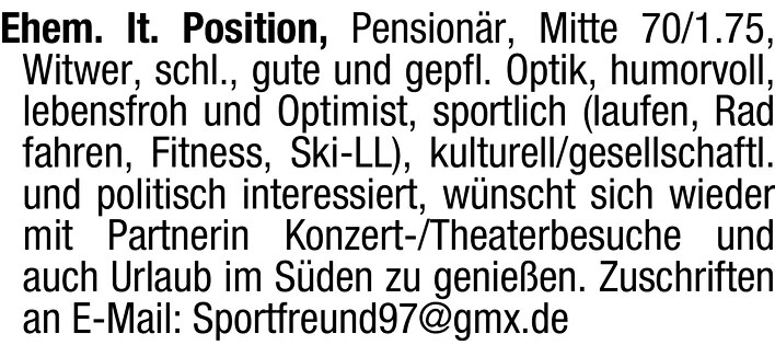 Pensionär (70er) sucht kulturbewusste Partnerin für gemeinsame Unternehmungen